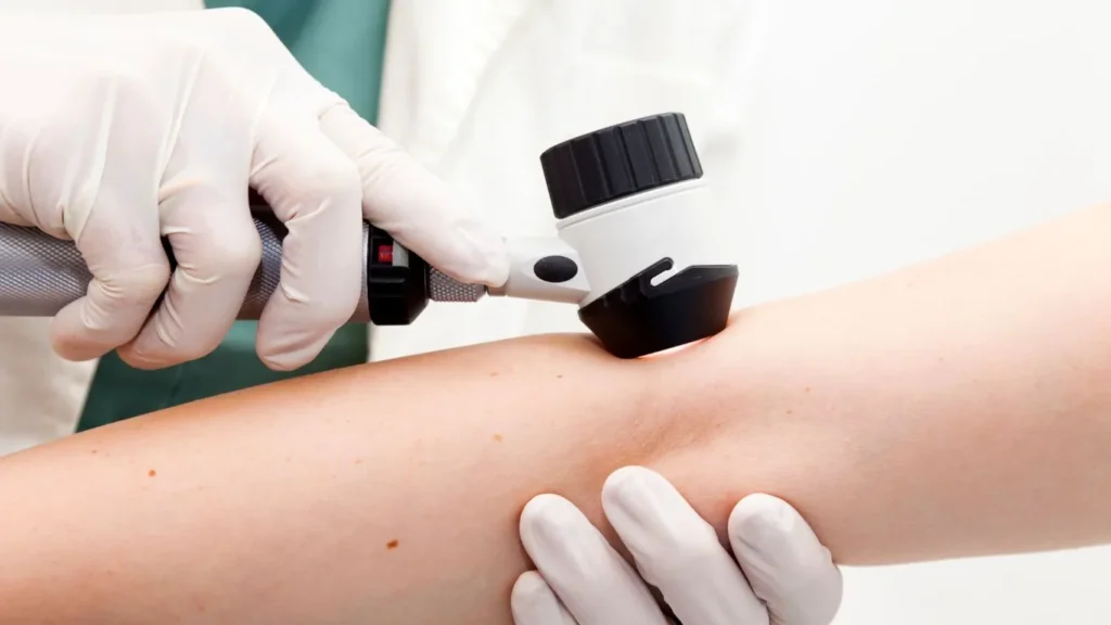 Dermoscopy is a non-invasive diagnostic technique that uses a dermoscope — a magnifying device with polarised light — to examine structures beneath the skin surface. It allows trained professionals to distinguish benign lesions from malignant ones with greater accuracy.